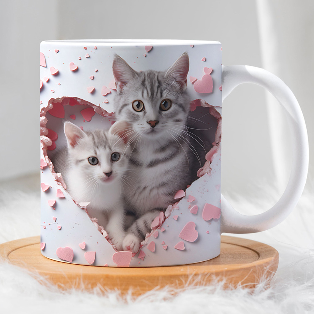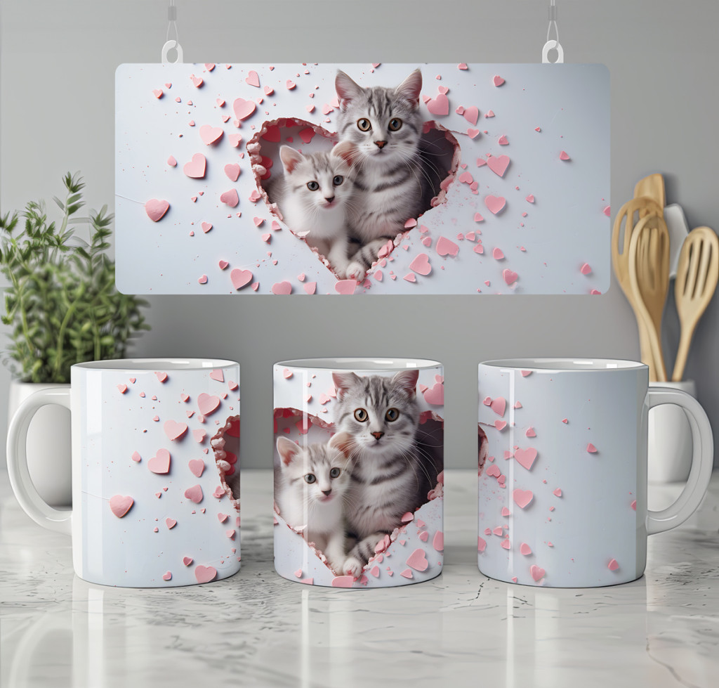 Kedves cicás mintájú bögre szív alakú háttérrel és romantikus részletekkel. Tökéletes ajándék macskabarátoknak, állatkedvelőknek vagy bárkinek, aki szereti a bájos, meghitt mintákat.