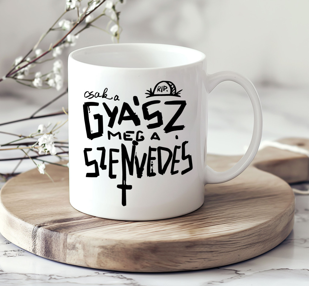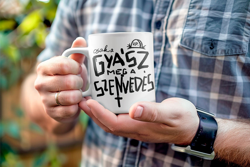 Ez a „gyász meg a szenvedés” bögre nem mindenkinek való – csak azoknak, akik értik az öniróniát és a jó fekete humort!